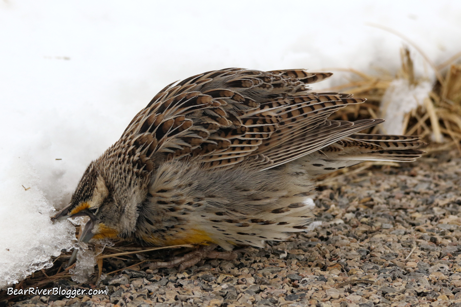 The search for food was only interrupted by brief moments when the meadowlark stopped and fluffed up its feathers for a bit, a tactic birds use to warm up in such extreme temperatures.
